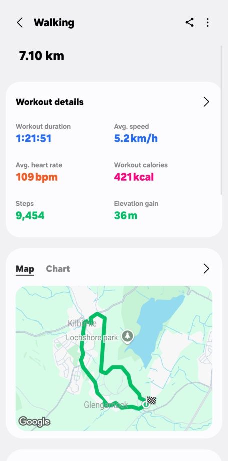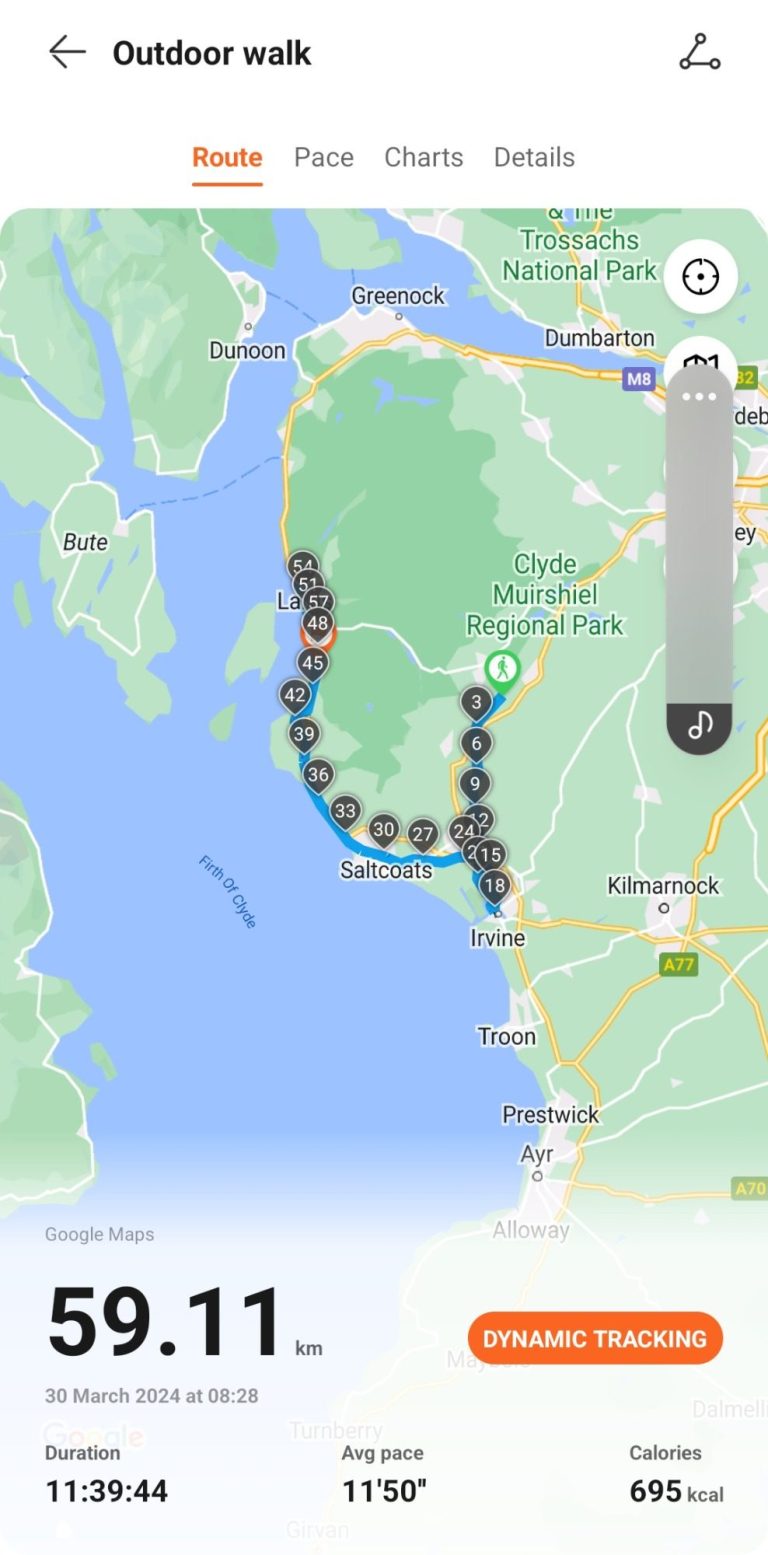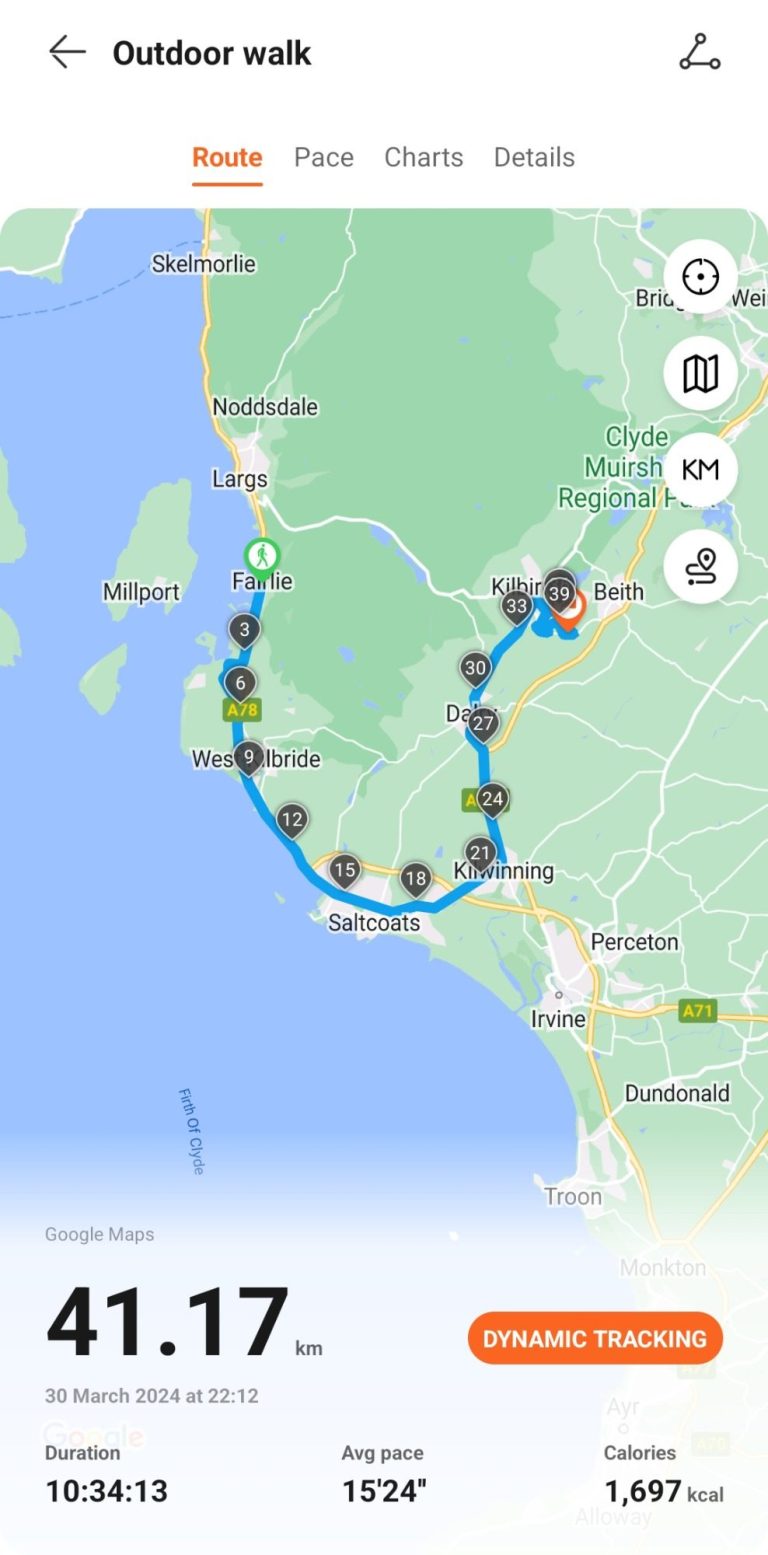 24/7/25 - Curly done a walk while working from Largs marina too Fairlie and back 6.74 km done in 1hr 26 mins, 9760 steps.